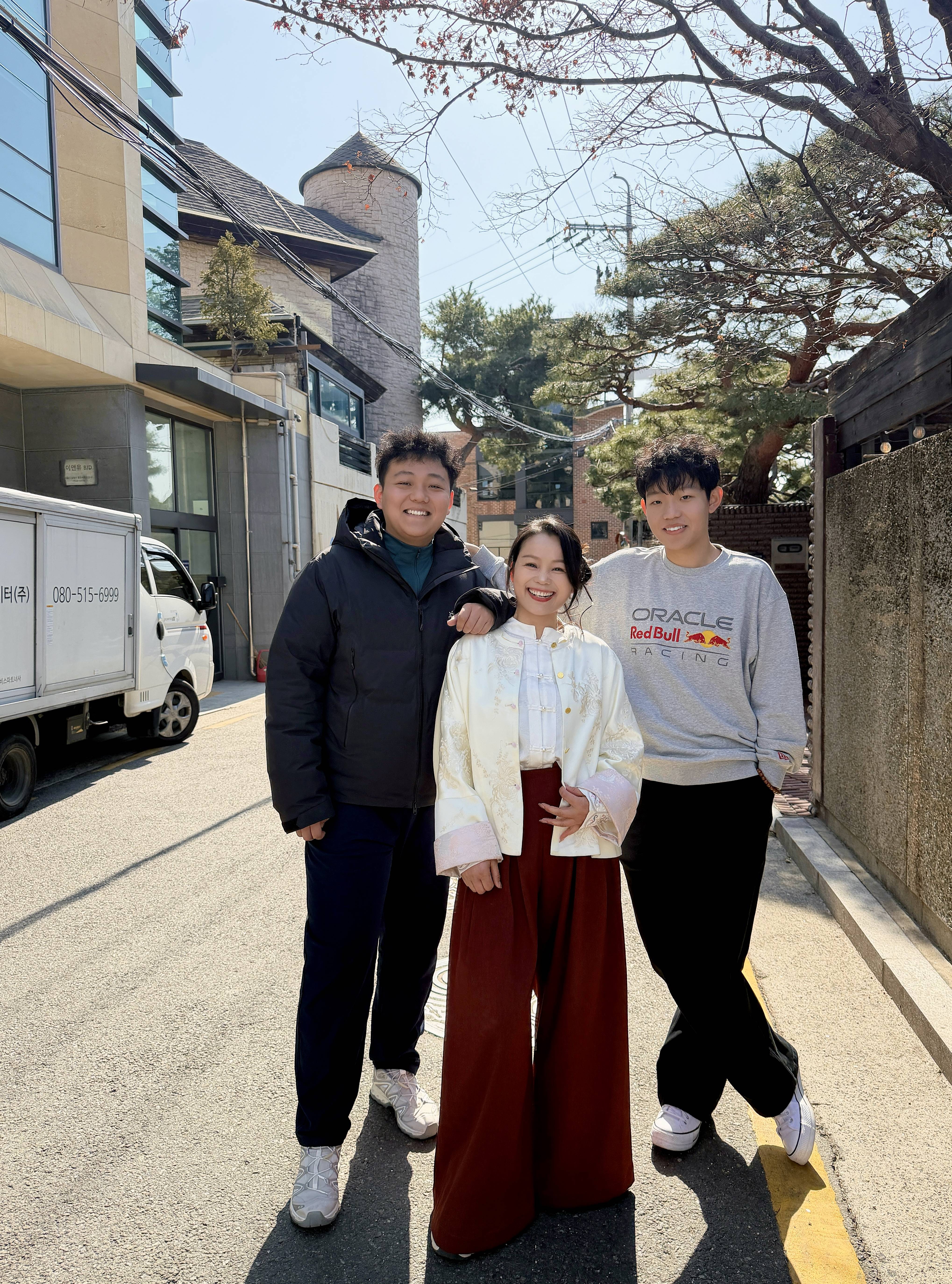 今年3月,姜甲儒(右一)和哥哥带妈妈去韩国旅行。受访者供图