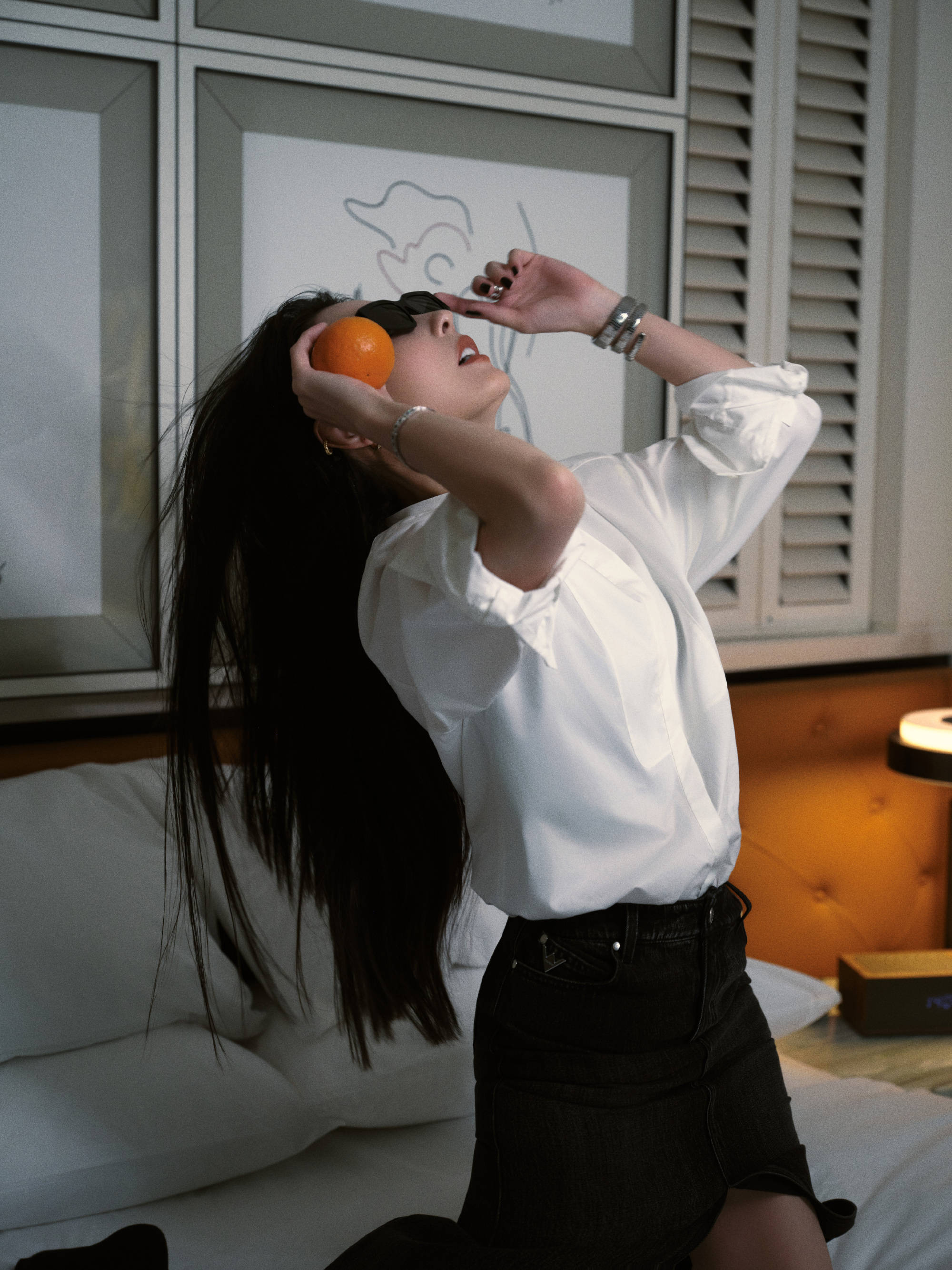 张柏芝趴在床上挑选墨镜。