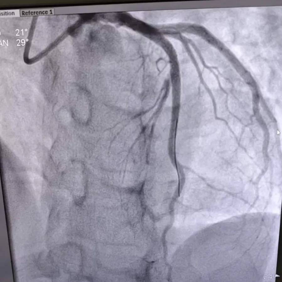 玉环二医胸痛中心立即启动绿色通道,林先生急诊冠脉造影结果令人惊心:心脏供血的关键血管——左前降支近中段狭窄高达90%,远端已完全闭塞,血管内堵塞着大量血栓,随时可能引发心脏骤停,危及生命。