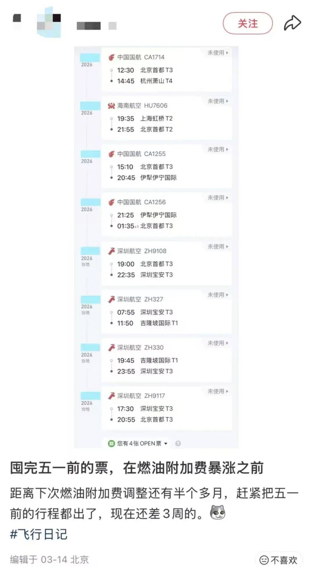 受中东局势持续影响,国际油价震荡,全球多家航司密集上调国际机票燃油费。3月25日,春秋航空率先发布通知,自2026年4月5日(含)零时起,按订单时间计算,上调国内航线燃油附加费,具体调整方案以后续通知为准。截至目前,国航、南航、东航等航司尚未发布调价通知。但业内普遍预计,其他航司也将陆续跟进。