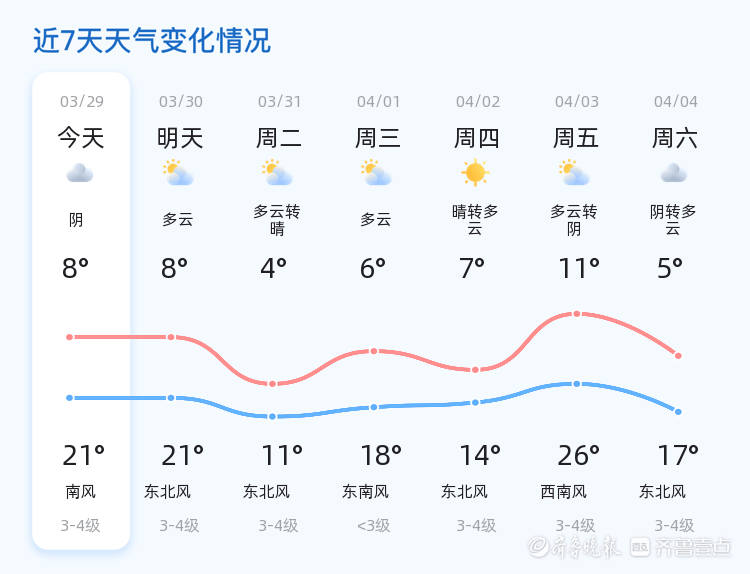 明天(3月30日),东营市天气将转为多云,气温与今日基本持平,最低气温8℃,最高气温21℃。风向将转为东北风,风力稍有增强,为3-4级。