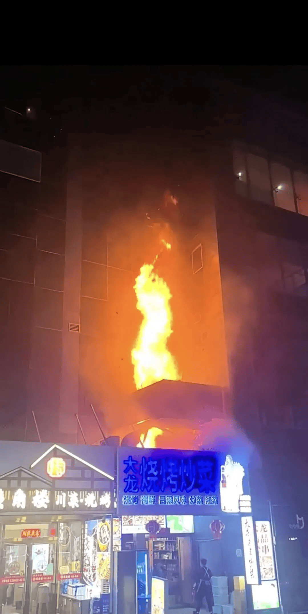 有目击者拍摄的视频显示,最开始,大楼底部一家烧烤店上方起火,喷出火舌。