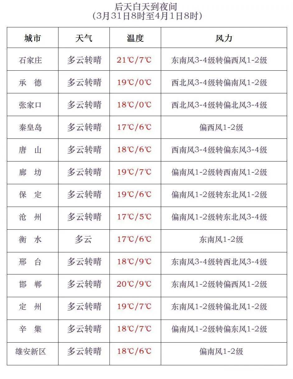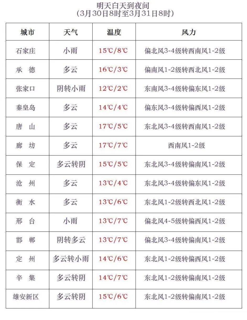明天夜间到31日,张家口、承德西部和保定、石家庄、邢台、邯郸四个地区的西部阴有小雨转多云,其中张家口、承德局地有雨夹雪或小雨;其他地区多云间晴。