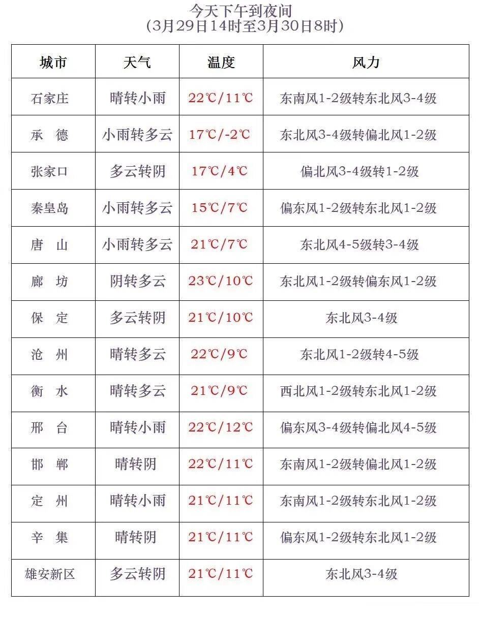 河北省气象台2026年03月29日11时32分发布大风蓝色预警信号:受东北平原南下冷空气影响,29日下午到夜间,唐山、秦皇岛、廊坊、保定东部、雄安新区、石家庄东部、沧州、衡水、邢台东部有北到东北风4到6级,阵风7到8级;29日傍晚到夜间,渤海海域和沿海地区有东北风5到6级,阵风7到8级。请注意防范。