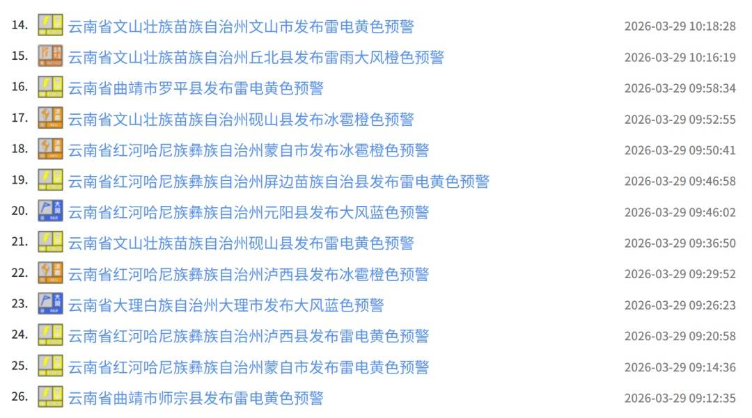 云南省气象台2026年03月29日08时00分继续发布雷电Ⅳ级预警:预计未来12小时雷电活动将持续,红河州、昆明市南部、临沧市、普洱市、曲靖市、文山州、玉溪市将出现较强雷电活动,出现雷击灾害事故的可能性大,局地伴有9级以上阵风、大冰雹、短时强降水等强对流天气,相关部门做好防雷电、防大风、防冰雹工作,公众在强对流过境期间暂停户外活动。
