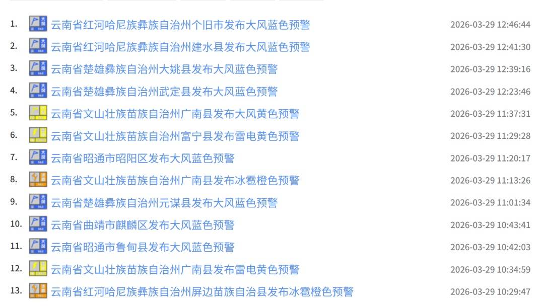 云南各地发布多条预警
