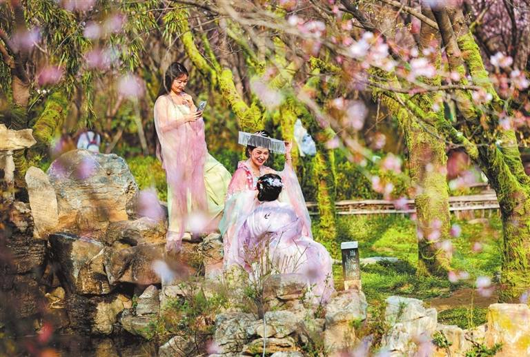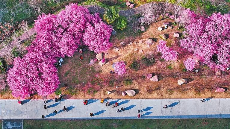 3月18日,洛阳隋唐城遗址植物园内,美人梅、紫玉兰、红叶李等花卉竞相盛开。市民游客漫步花间,尽享春日美景,一派生机盎然的醉人画卷徐徐展开。 王宏欣 摄