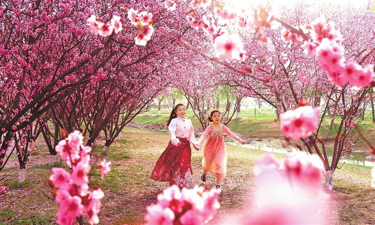 三月的中原大地,正以“中国色”为墨,绘就流动的春日丹青,让美好瞬间成诗。郑州航空港的春桃灼灼其华,为归来的飞机“结彩”;周口沙颍河畔樱红陌上,伴着货船汽笛喜迎朝阳;荥阳古柏渡万树盈盈,粉色花海与黄河碧水共谱生态诗篇;素有“花都”美誉的许昌鄢陵群芳竞艳,市民身着汉服畅游其中,步步入画;巩义宋陵的点点油菜花为春耕添上鲜亮一笔……这些散落在生活中的“中国色”,织就了一张无形的情绪调节网,也为忙碌的人们提供了一处心灵休憩的港湾。