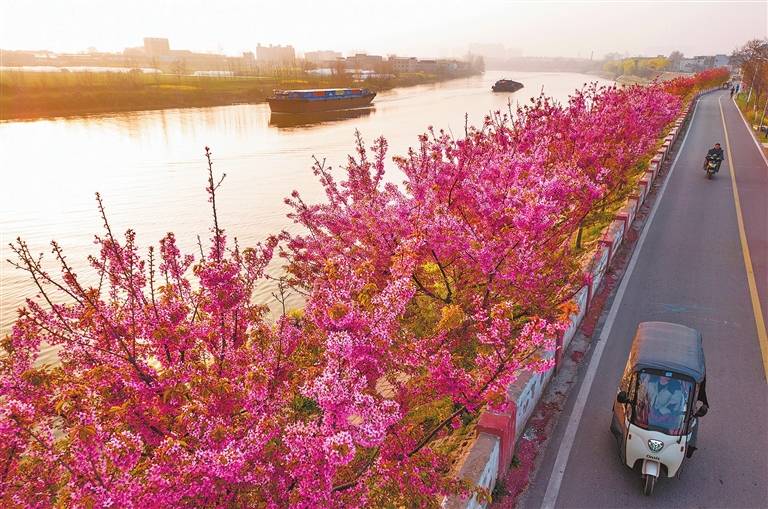 3月25日清晨,沙颍河项城段,两艘货船缓缓驶过,岸堤樱花烂漫盛放,勾勒出一幅春日水运诗意画卷。 张珑瀚 摄