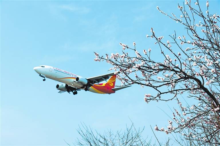 3月19日,郑州新郑国际机场外飞机掠过天空。 本报全媒体记者 王铮 摄