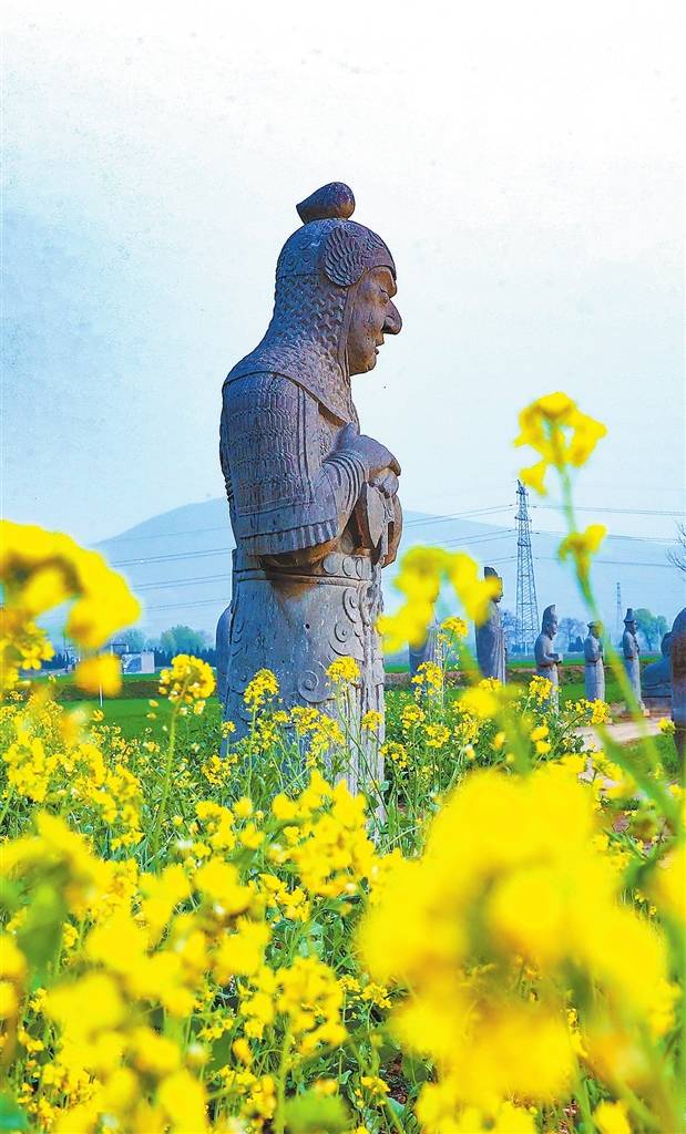坐落于油菜花田中的宋陵石像生(3月17日摄)。本报全媒体记者 聂冬晗 摄