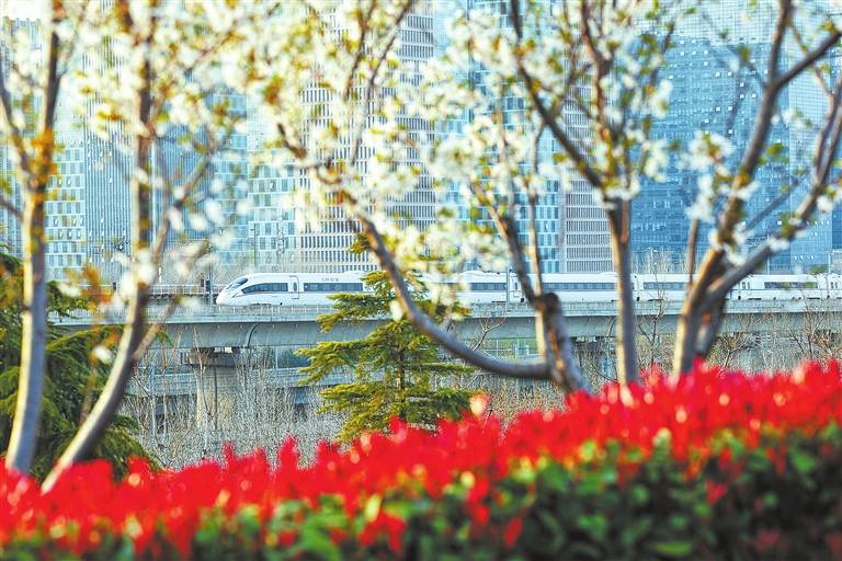 郑州东站驶出的高铁,迎着春光,穿过城市和花海,开往春天的深处(3月22日摄)。 本报全媒体记者 贠洪波 摄