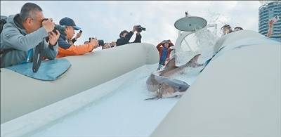 在湖北宜昌市胭脂园长江珍稀鱼类放流点,中华鲟顺着滑道进入长江。 黄苍也摄