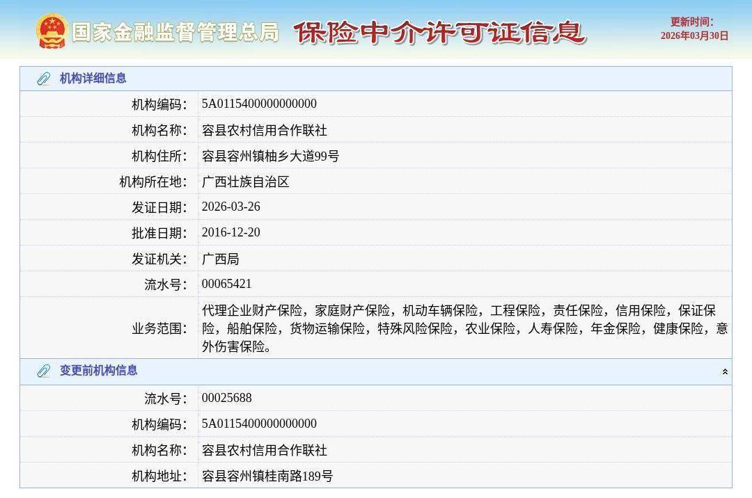 3月30日,根据国家金融监管总局许可证信息查询平台,容县农村信用合作联社换发保险中介许可证,发证日期2026年3月26日。