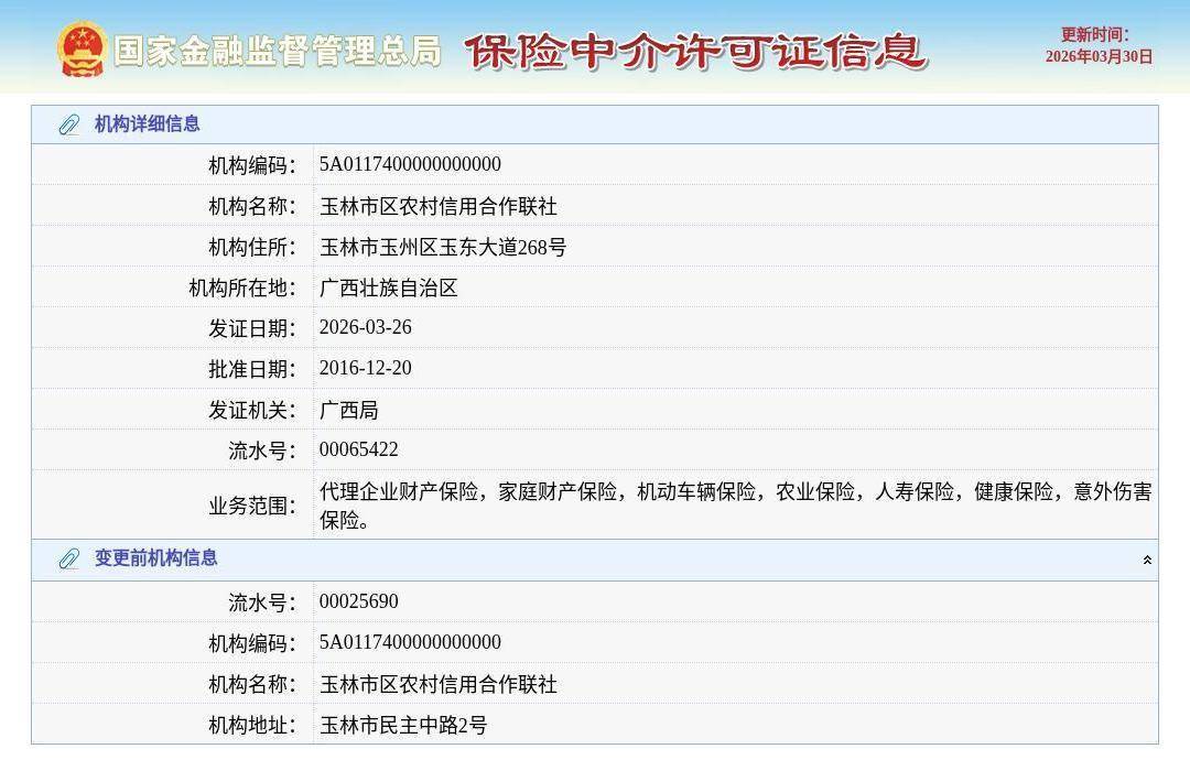 3月30日,根据国家金融监管总局许可证信息查询平台,玉林市区农村信用合作联社换发保险中介许可证,发证日期2026年3月26日。