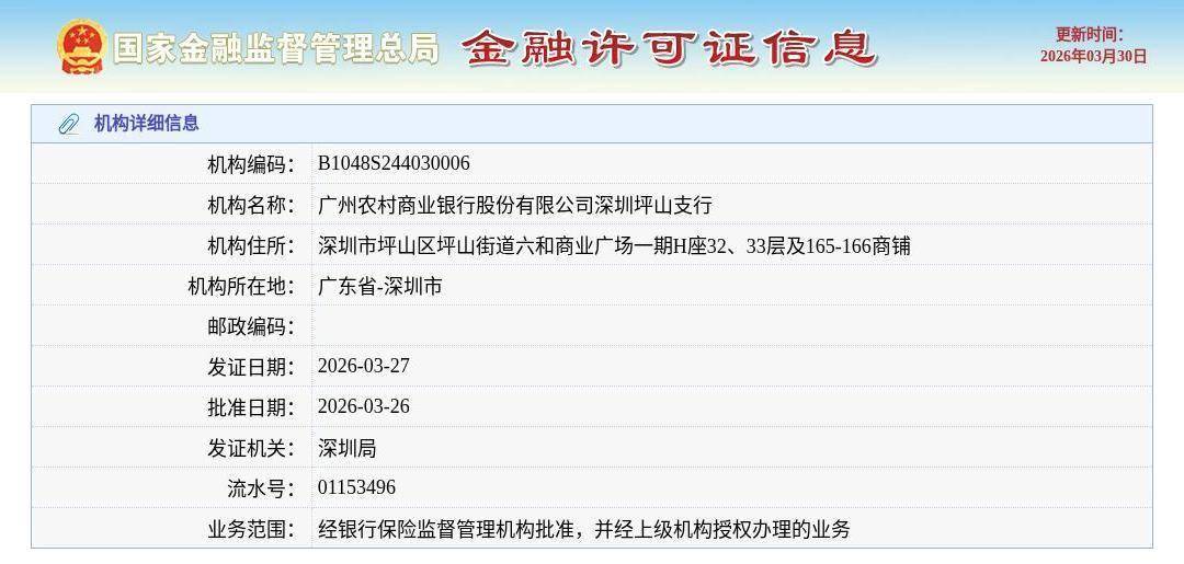 3月30日,根据国家金融监管总局许可证信息查询平台,广州农村商业银行股份有限公司深圳坪山支行颁发金融许可证,发证日期2026年3月27日。