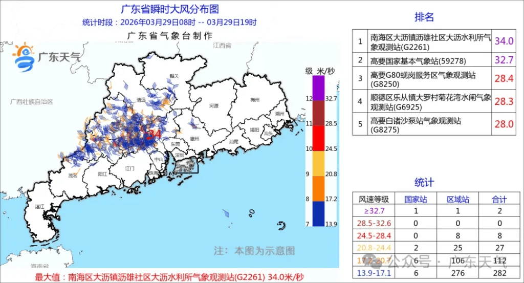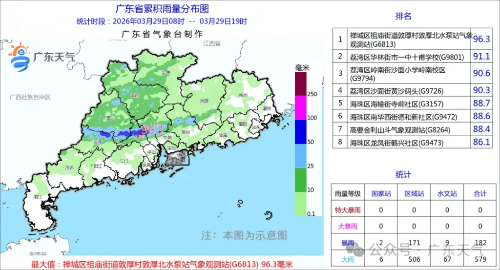 据气象水文监测,3月29日08时到19时,全省有81个镇街录得超过50毫米的暴雨,有171个镇街录得25毫米~50毫米的大雨,各市雨量最大的镇街有:佛山禅城区祖庙街道96.3毫米、广州荔湾区华林街道91.1毫米、肇庆高要区金利镇88.4毫米、云浮云安区都杨镇76毫米;另外,全省有2个气象站录得超过32.7米/秒的12级大风,有6个气象站录得24.5米/秒~28.5米/秒的10级风,有23个气象站录得20.8米/秒~24.5米/秒的9级风,有68个气象站录得17.2米/秒~20.8米/秒的8级风。