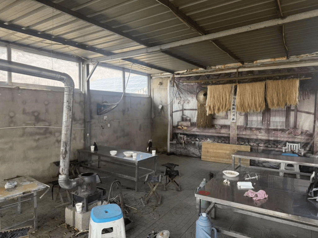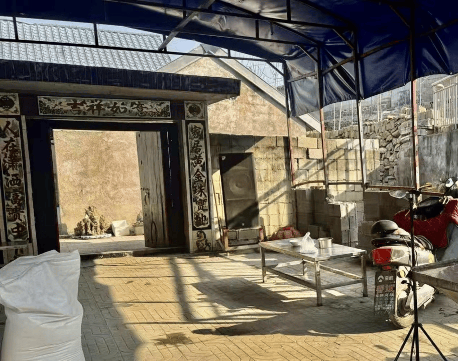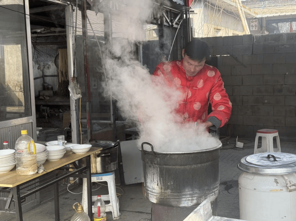 院落门口搭着简易的棚子,几张木桌整齐摆放,棚下的案板上还沾着未干的面粉。一旁的煤炉里炭火正旺,熬着的骨汤咕嘟作响,香菜和辣椒油的香气在空气中飘散。