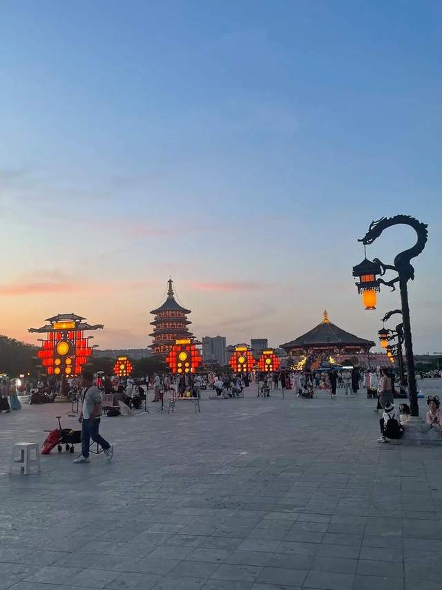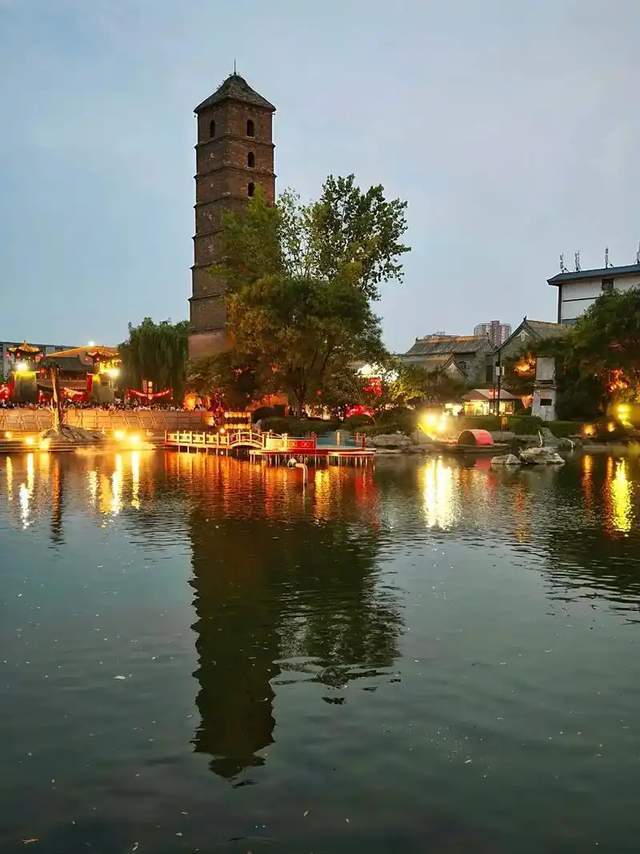 洛邑古城·文峰塔,傍晚亮灯后,灯笼巷+塔影倒影,走在石板路上,有种梦回大唐的感觉。