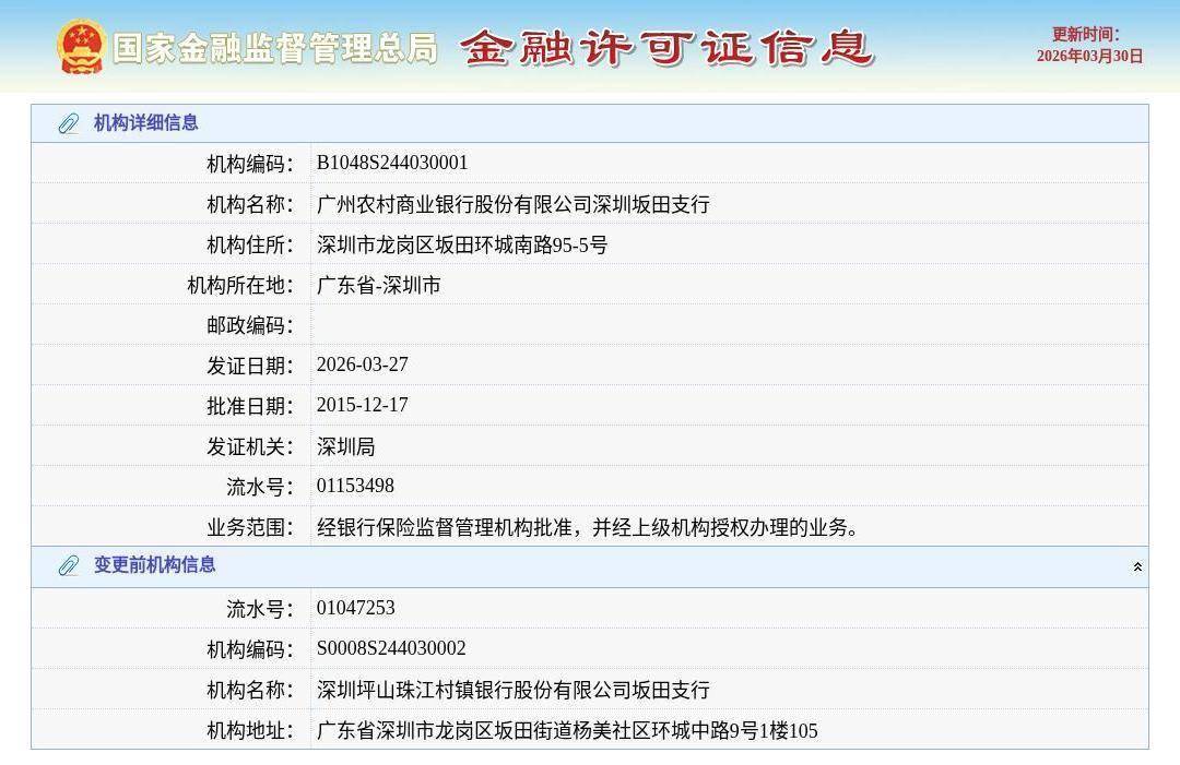 3月30日,根据国家金融监管总局许可证信息查询平台,广州农村商业银行股份有限公司深圳坂田支行换发金融许可证,发证日期2026年3月27日。
