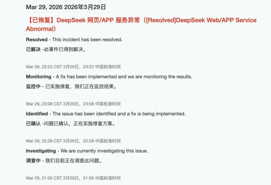 3月29日夜间至30日上午,AI大模型服务商DeepSeek突发大规模服务中断,其网页端、手机App均出现无法正常使用的情况,大量用户反馈无法发起新对话、现有对话中断等问题,此次服务崩溃持续时长接近12小时,引发广泛关注。截至上午10时许,DeepSeek官方表示,经过两次紧急修复,平台各项服务已全面恢复正常。