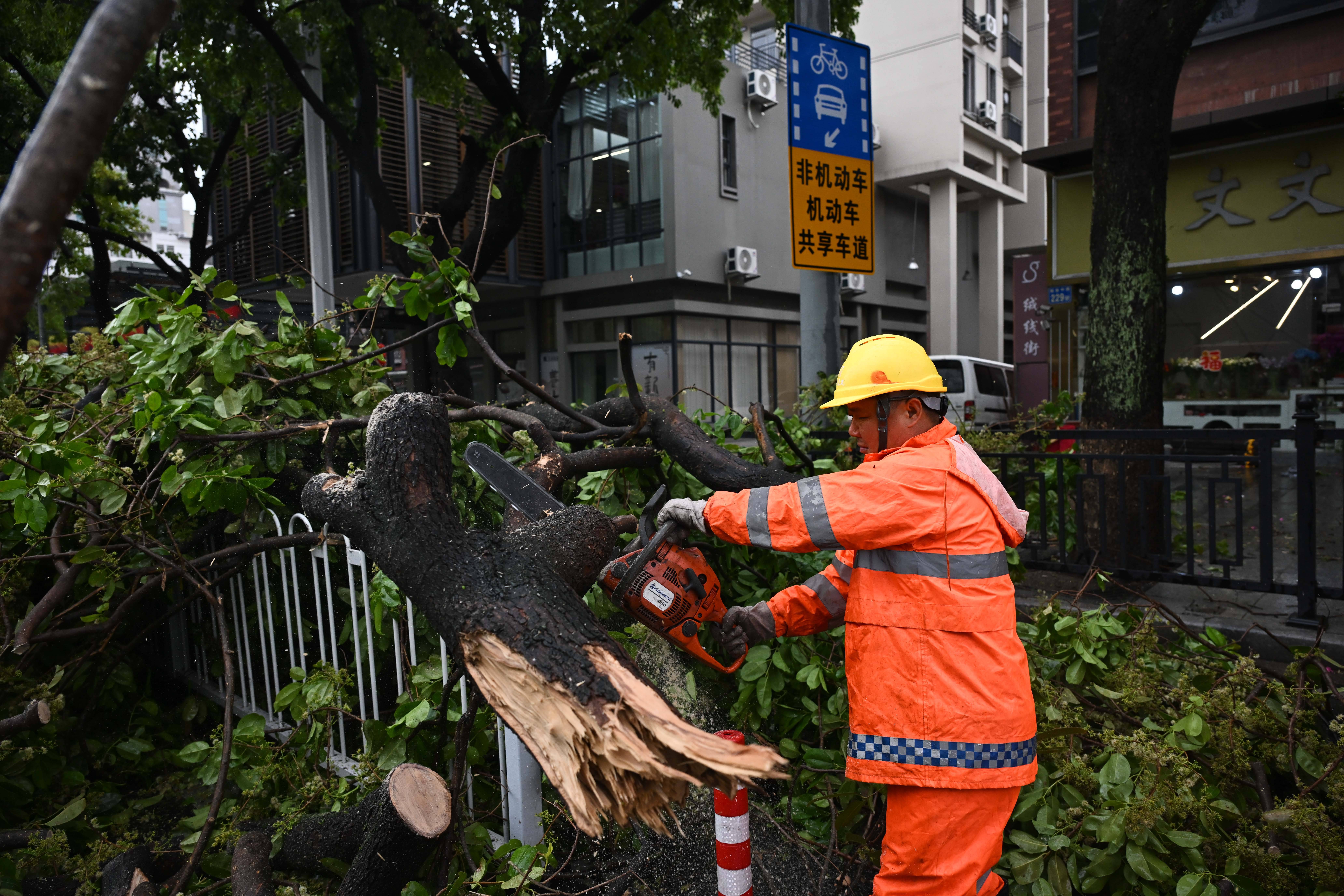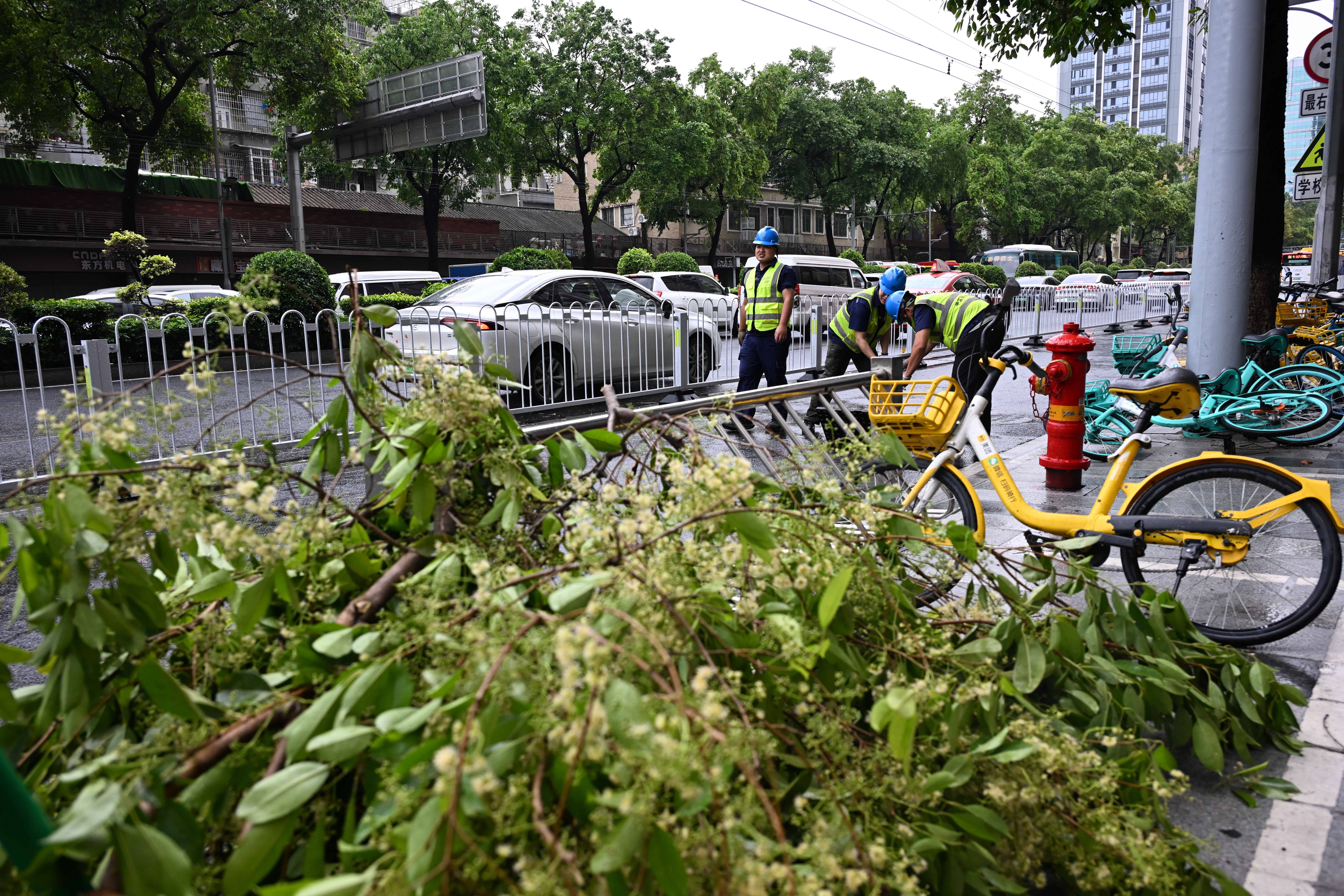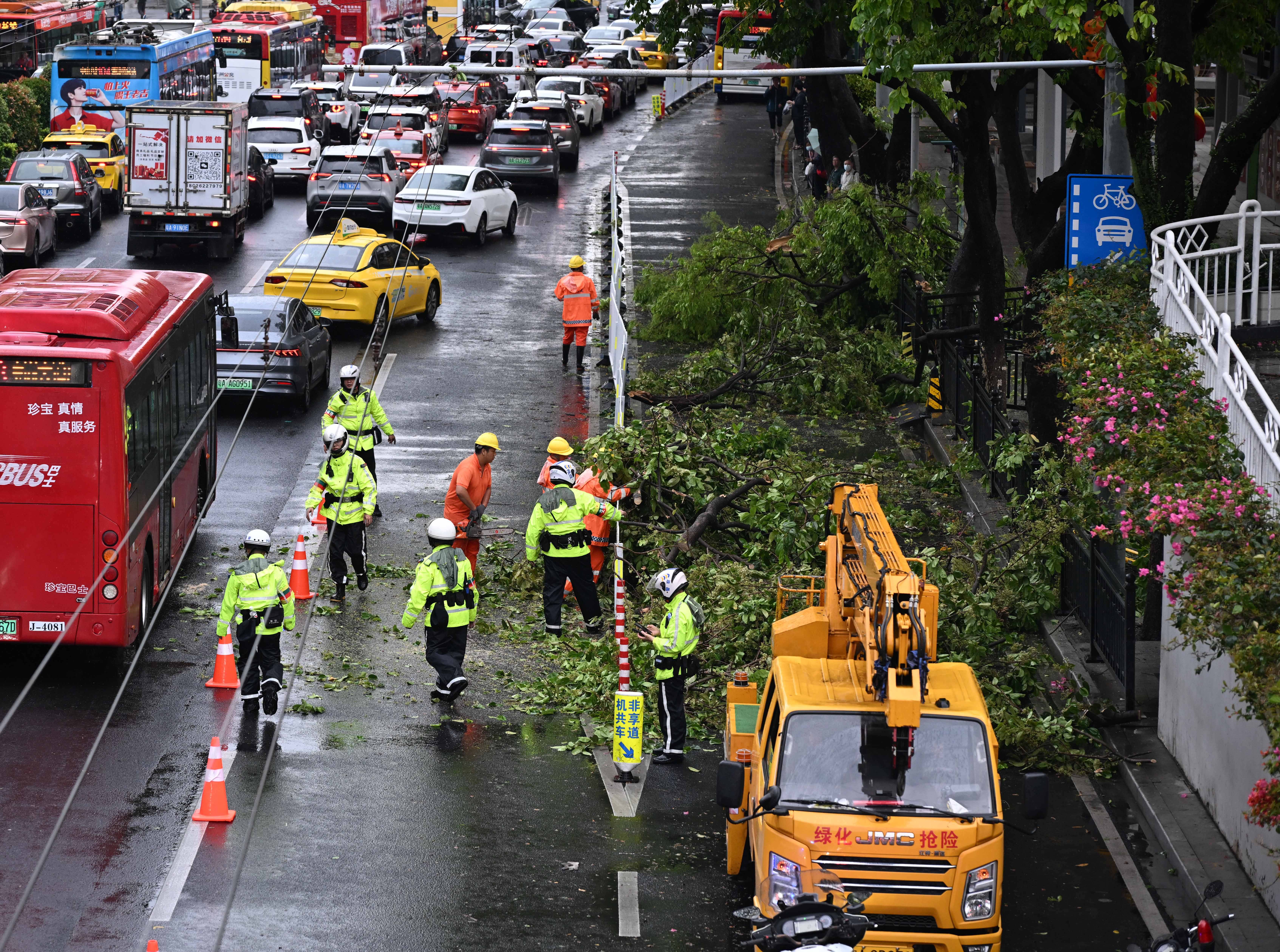 3月30日,在广州市越秀区解放中路,工作人员在清理倒伏树木。 新华社记者 邓华 摄