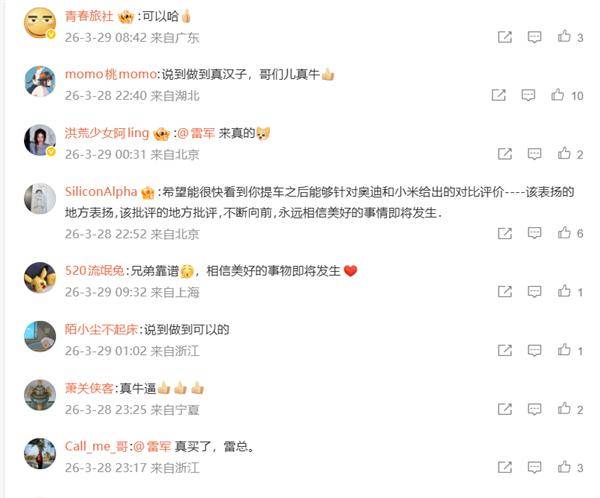 也有不少网友已经提前蹲起了后续,喊话车主提车后一定要出真实测评:“希望能很快看到你提车之后针对奥迪和小米给出的对比评价,该表扬的地方表扬,该批评的地方批评”。