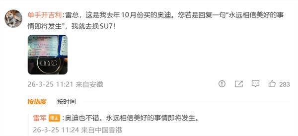 故事的开端,要从3月25日那场全网围观的互动说起。安徽网友@单手开吉利 在雷军的微博评论区,晒出了自己去年10月刚提的奥迪,当场立下赌约:“雷总,您若是回复一句‘永远相信美好的事情即将发生’,我就去换SU7!”