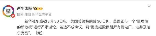 美国总统特朗普30日称,美国正与一个“更理性的新政权”进行严肃讨论,若达不成协议,将“彻底摧毁伊朗所有发电厂、油井及哈尔克岛”。