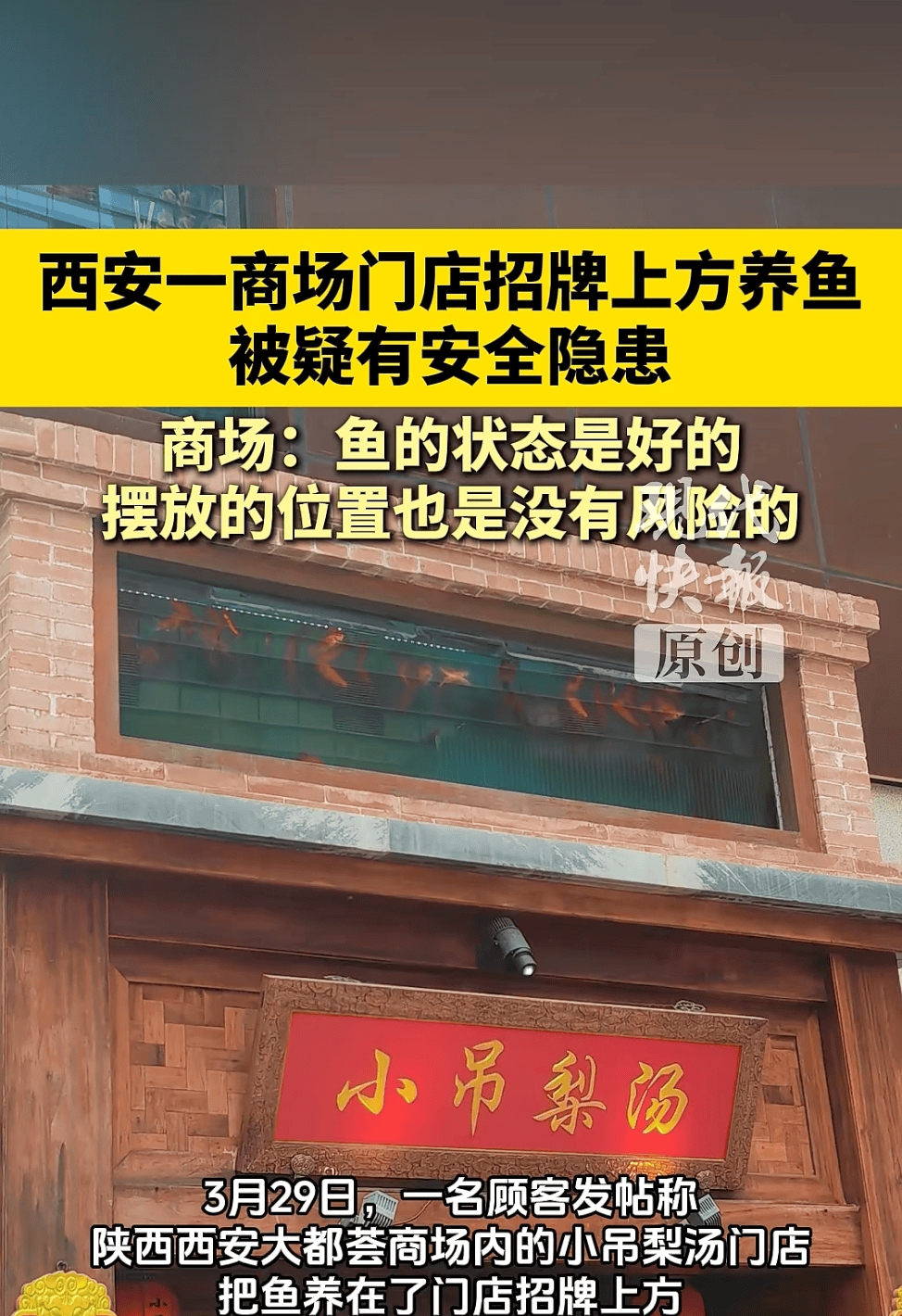 3月29日,一名顾客发帖称,陕西西安大都荟商场内的小吊梨汤门店,把鱼养在了门店招牌上方。鱼缸水看起来浑浊不堪,被网友质疑“对观赏鱼不友好且有掉落风险”。