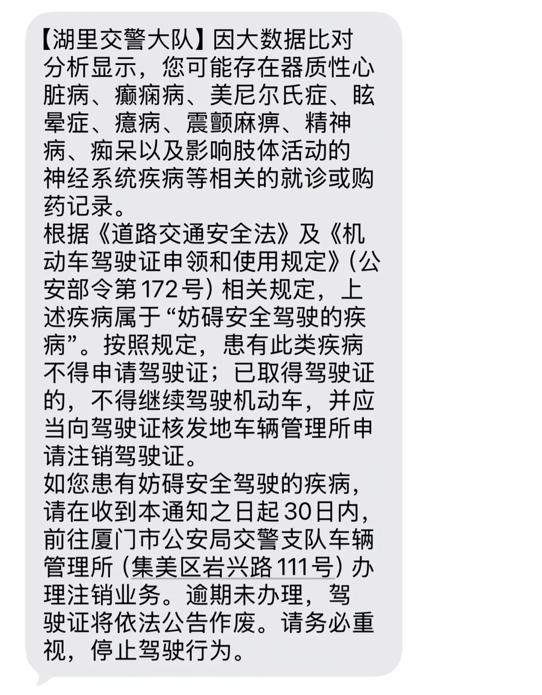 近日,一条通知注销驾驶证的短信备受关注,短信写道:(湖里交警大队)因大数据比对分析显示,您可能存在器质性心脏病、癫痫病、美尼尔氏症、眩晕症、癔病、震颤麻痹、精神病、痴呆以及影响肢体活动的神经系统疾病等相关的就诊或购药记录。