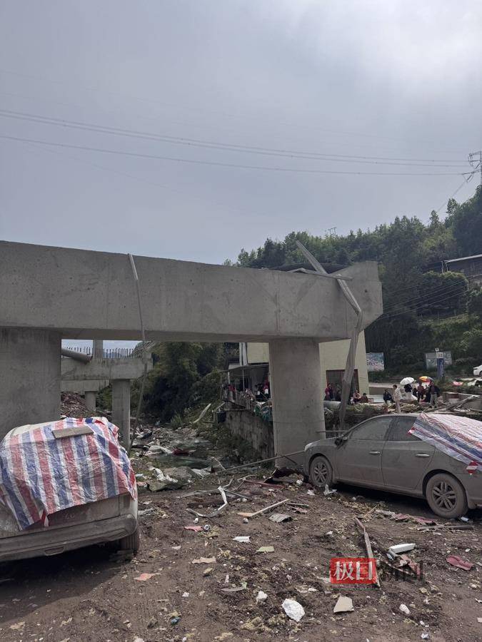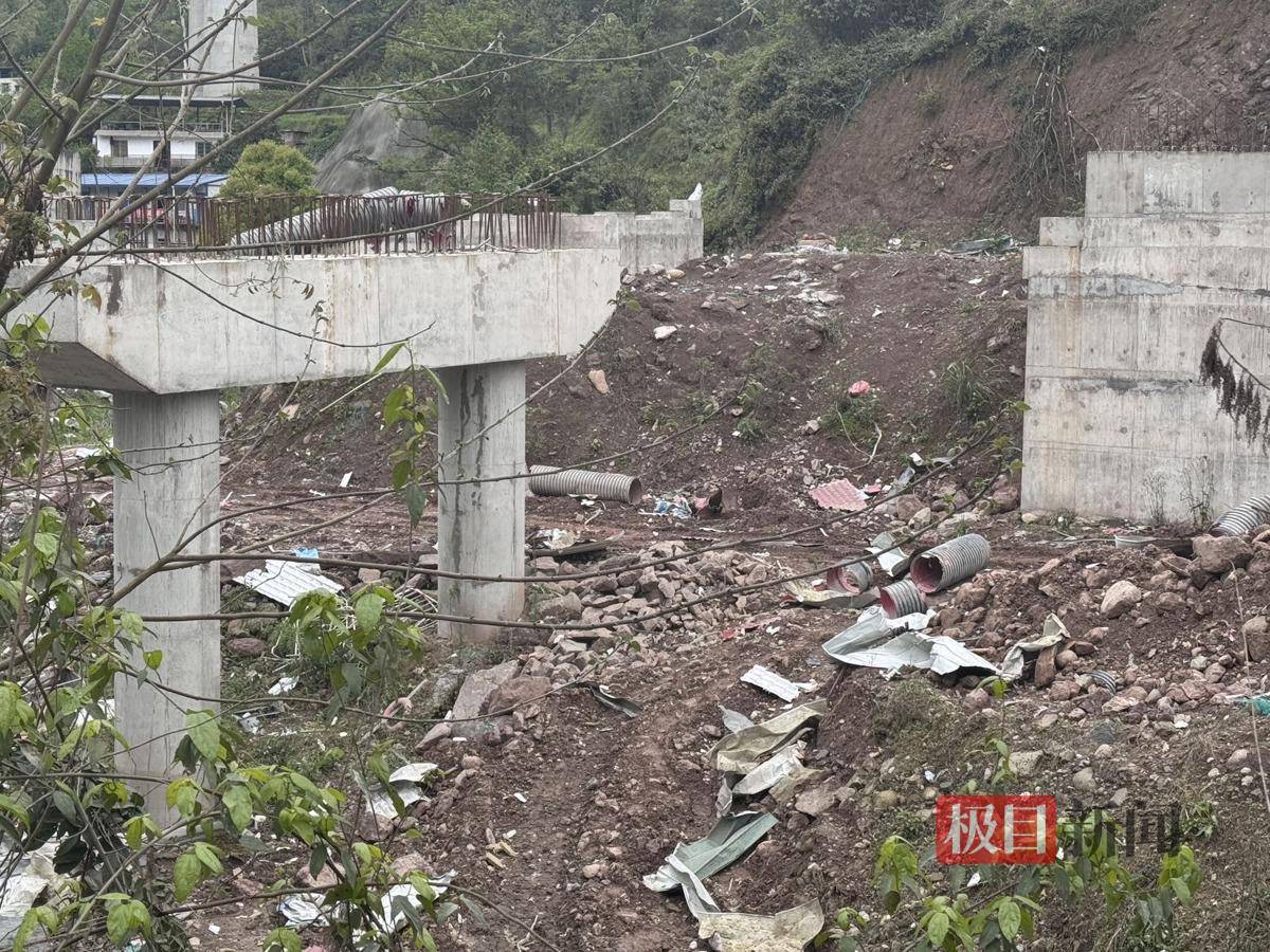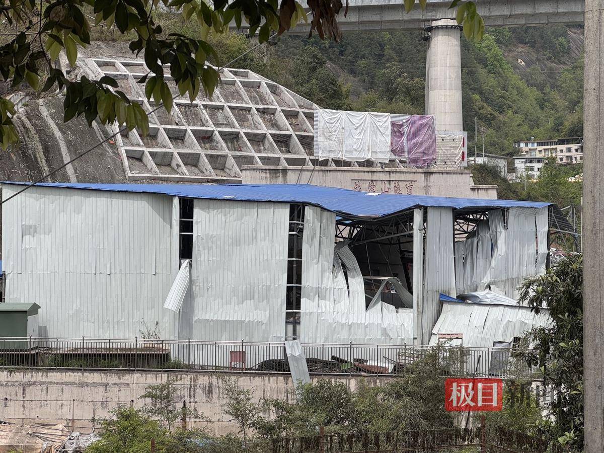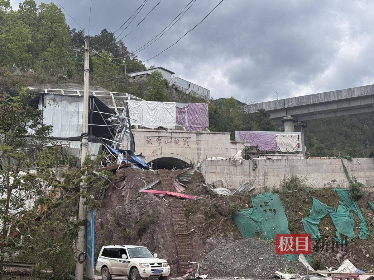 记者在现场看到,隧道外修建的彩钢棚板房遭到损坏,隧道口对面山体有不少白色建筑物碎片,还有钢架和管道被冲至洞口外数十米远的墩柱上,有环境应急监测人员在现场监测气体。村民们称,在此处干活的工人都是外地人,发生爆炸后就放假了。