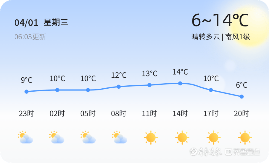 今天是4月1日,星期三,农历二月十四,也是西方传统节日愚人节。愚人节起源于西方,通常在这一天,人们会互相开玩笑、捉弄,但需注意适度,避免造成不必要的误会或伤害。烟台市今日天气晴转多云,气温介于6℃至14℃之间,南风1级,空气湿度44%,PM2.5指数46,整体空气质量良好。各区天气情况基本一致,适合市民户外活动。