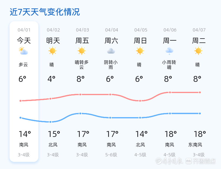 明日烟台天气将以晴朗为主,气温有所回升,预计最低气温4℃,最高气温15℃,风力南风3-4级。与今日相比,明日天气晴朗,气温略有上升,市民可适当减少衣物,享受春日暖阳。