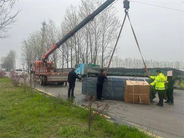由于车上满载花卉,车身沉重,民辅警多次合力尝试均未能将车辆扶正。就在民警准备联系专业救援力量时,一辆号牌为豫LN8885的吊车恰好途经现场。民警向吊车车主说明情况,车主二话不说,主动伸出援手,义务帮忙将侧翻的三轮车吊正,并坚决不肯收取任何费用。
