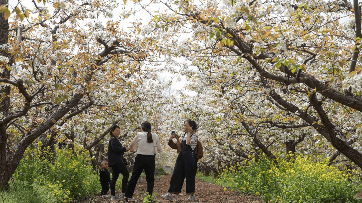 盛放的梨花吸引游客拍照打卡(李峰 摄)