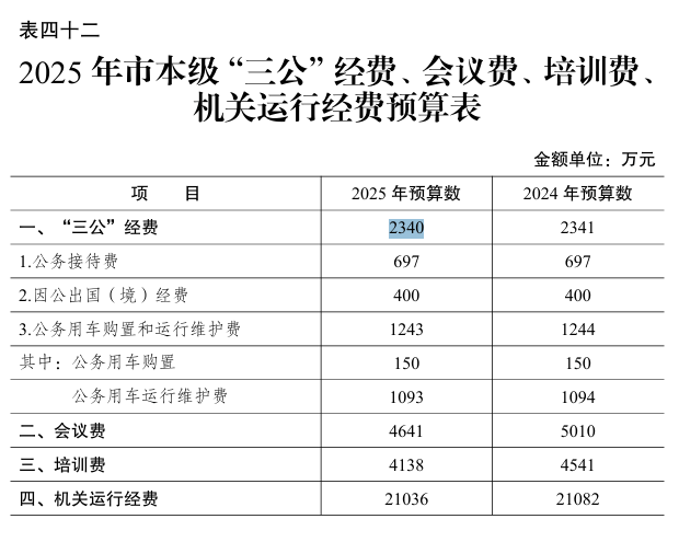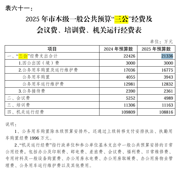 以南京市为例。2026年2月公布的《》中,明确写到2026年市本级“三公”预算为21506万元,相比2025年的预算数22136万元减少2.7%(表3)。然而,在2025年1月公布的《》中却写着,2025年预算数为21336万元(表4),比上年预算数22426万元减少 4.9%。
