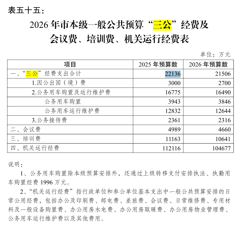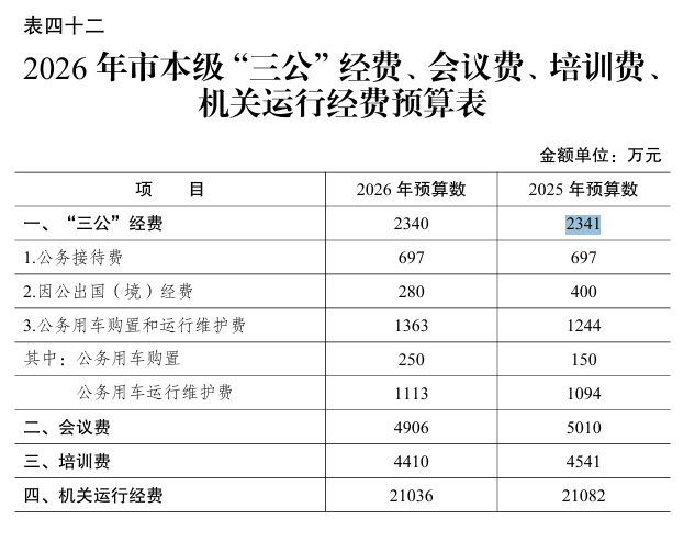 盐城也出现了类似情况。在2026年2月公布的《》中提到,“2026年市级一般公共预算安排的‘三公’经费总额4912万元,比2025年预算数5147万元减少235万元,下降4.57%”。然而,在2025年2月公布的《》中,写到“2025年市级一般公共预算安排的‘三公’经费总额4732万元,比上年预算5138万元减少406万元,下降7.8%。”