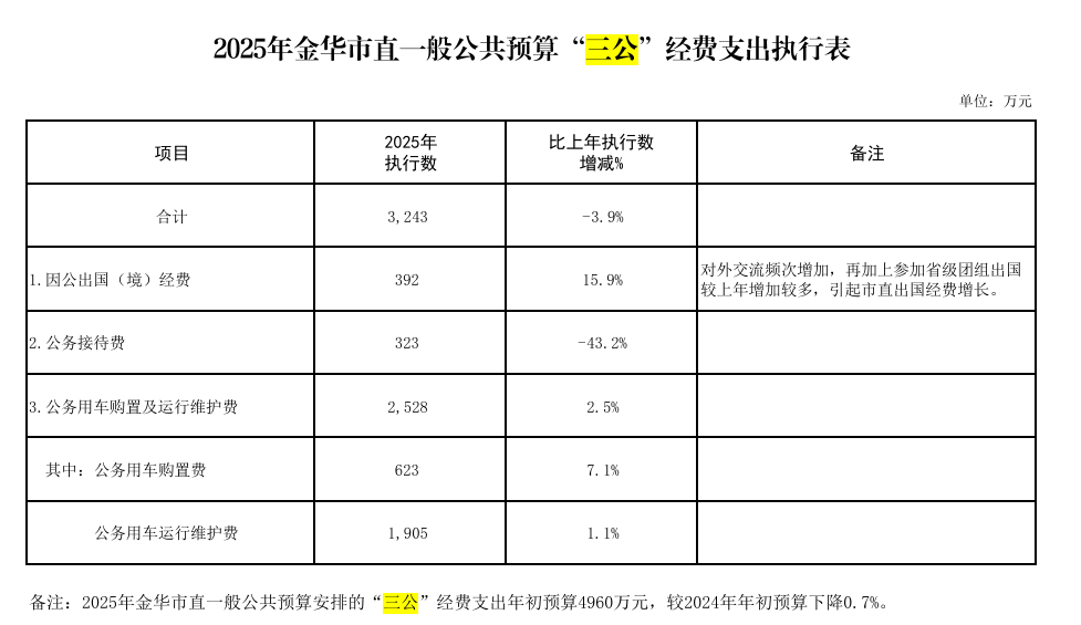 2025年金华市直一般公共预算“三公”经费支出预算为,但2025年金华市直一般公共预算“三公”经费支出执行仅为,执行数为预算数的65.4%。如此可见,2026年金华市“三公”预算为4950万元,在去年预算基础上减少了10万元,在实际执行中形成的刚性约束并不大。