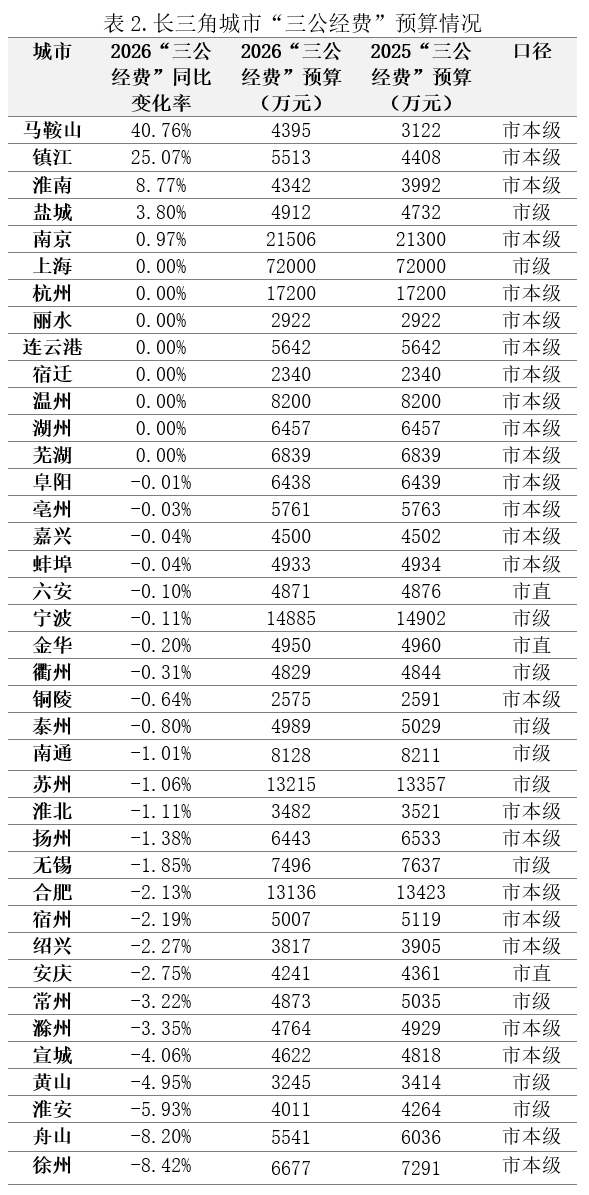 2026年长三角城市普遍持续压减“三公经费”账面预算(表2)。2026年“三公”预算相对2025年初公布的去年预算,有5个城市上升,8个城市持平,15个城市微量压减(压减率小于2%),11个城市明显压减(压减率大于2%)。