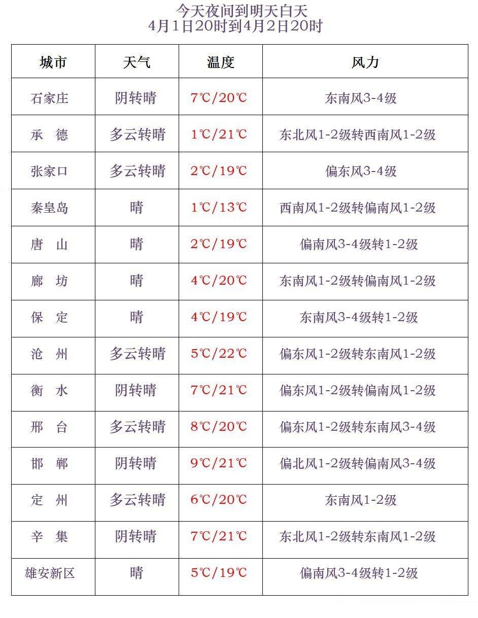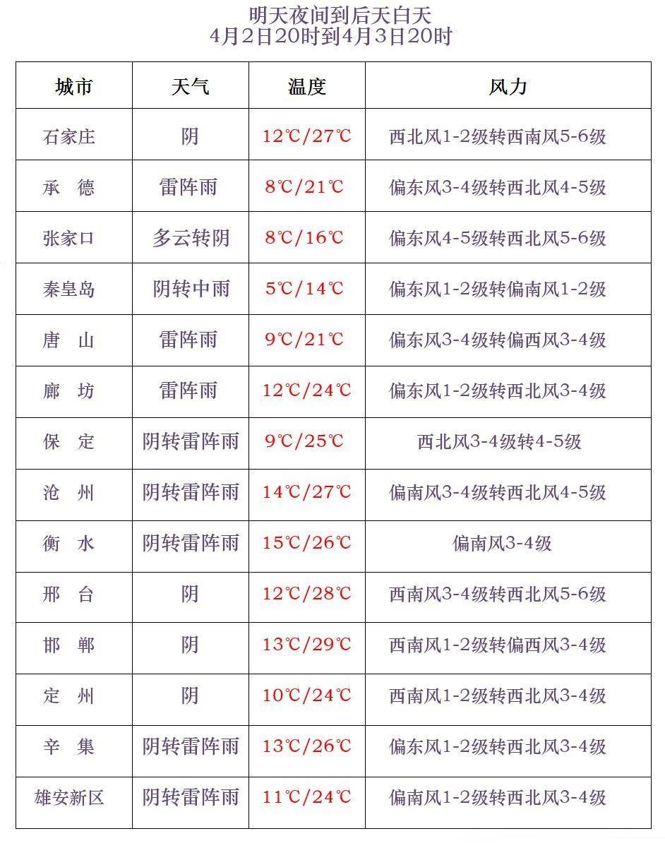 明天夜间到3日,全省多云转阴,张家口北部、承德北部有雨夹雪或小雪,张家口中南部、承德中南部、唐山、秦皇岛、保定、雄安新区、廊坊、石家庄东部、沧州、衡水、邢台东部、邯郸东部有雷阵雨或阵雨,其中唐山、秦皇岛局地有中雨。