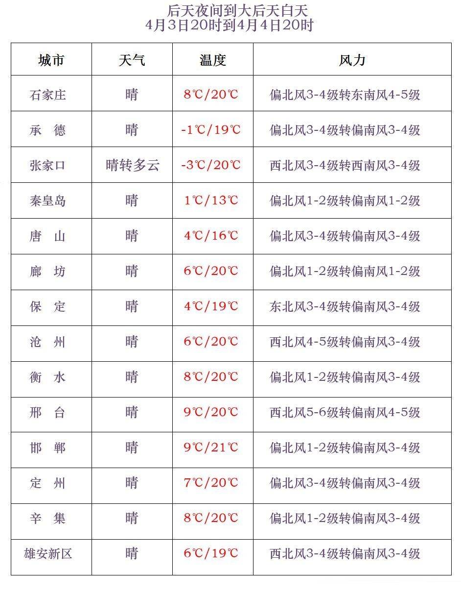 2日夜间到3日白天,张家口、承德、保定西北部有北到西北风5到7级,阵风8到9级,局地可达10到11级;其他地区有西北风4到6级,阵风7到8级,局地可达9级以上,全省大部分地区伴有扬沙或浮尘天气。