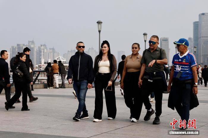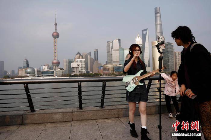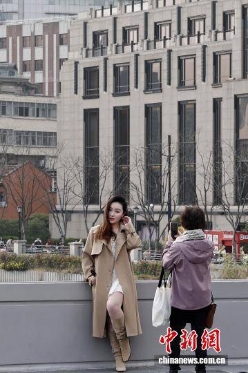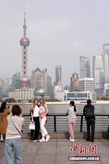 4月1日,游客在外滩滨江步道上合影。上海中心气象台最新预报显示,当日,上海全市最高气温稳稳爬升至20℃附近。预计4月2日上海天气多云,最高气温可达23℃。中新社记者 殷立勤 摄