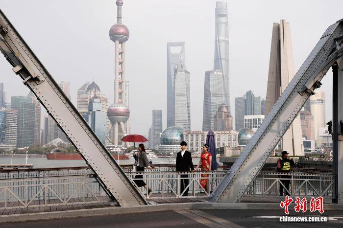 4月1日,游客在乍浦路桥上拍照。