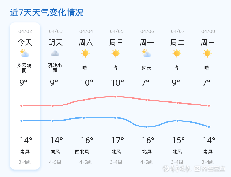 今天是4月2日,星期四,农历二月十五。青岛市迎来多云转阴的天气,气温在9℃至14℃之间,西北风2级,空气湿度高达98%,PM2.5指数为90,空气质量良好。各区天气情况基本一致,市民出行需注意保暖和防风。nn明天,青岛市天气将转为阴天并伴有小雨,气温与今日持平,风力有所增强,南风4-5级。市民需提前做好防雨准备,出行时携带雨具,注意交通安全。nn未来三天,青岛市天气趋势总体平稳。周六和周日天气晴朗,气温逐渐回升,最高气温可达16℃,最低气温维持在9℃左右,但风力较大,市民需注意防范大风对户外活动的影响。周一周二天气以多云为主,气温略有波动,市民需根据天气变化适时增减衣物。nn温馨提示