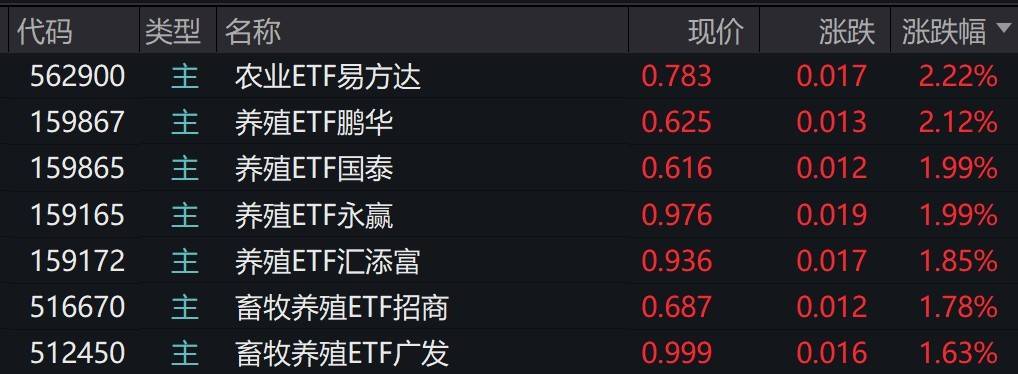 受盘面影响,农业、养殖相关ETF涨约2%。