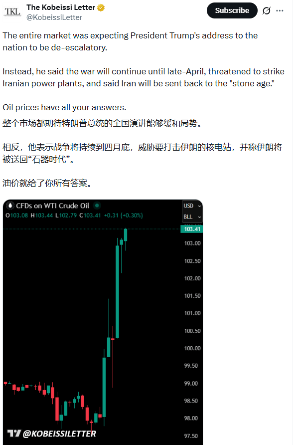 Pepperstone Group研究策略师Dilin Wu则直言,特朗普的演讲"确实令人失望"。她指出,特朗普早前关于从中东抽身的说法,"现在看来更像是为了安抚市场,同时保留施压选项","他显然仍然倾向于先施压后缓和局势的策略,而不是简单明了的降温。"