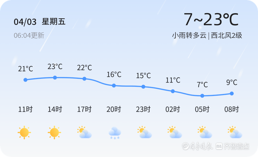 今天是4月3日,星期五,农历二月十六。泰安市今天天气为小雨转多云,气温在7摄氏度至23摄氏度之间,西北风2级,相对湿度65%,空气质量指数102。各区天气情况总体平稳,未出现极端天气情况,市民出行需注意携带雨具以备不时之需。