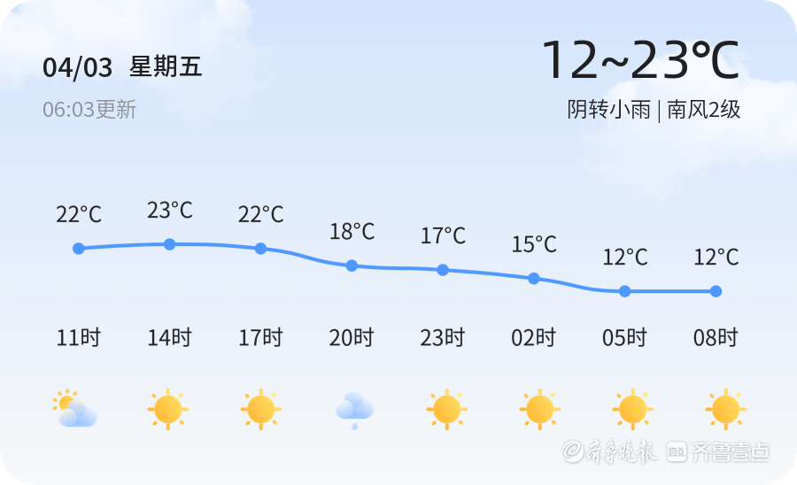今天是4月3日,星期五,农历二月十六。济宁市今天天气为阴转小雨,气温介于12℃至23℃之间,南风2级,空气湿度为79%。目前PM2.5浓度为100,空气质量为轻度污染。市民在外出时应佩戴口罩,注意防护。今天早晨气温较低,建议市民出行时增添衣物,随身携带雨具,注意交通安全。