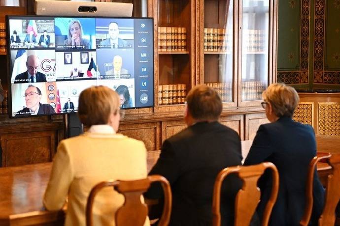 在4月2日的日本和欧洲线上外长会后,英国外交大臣库珀发表了主席声明,内容显示会议讨论了以下几点:要求重新开放海峡并拒绝支付过境费;研究包括制裁在内的经济和政治措施;与国际海事组织合作,确保被困船只和海员获释;采取措施确保市场和航运安全,例如信息共享。